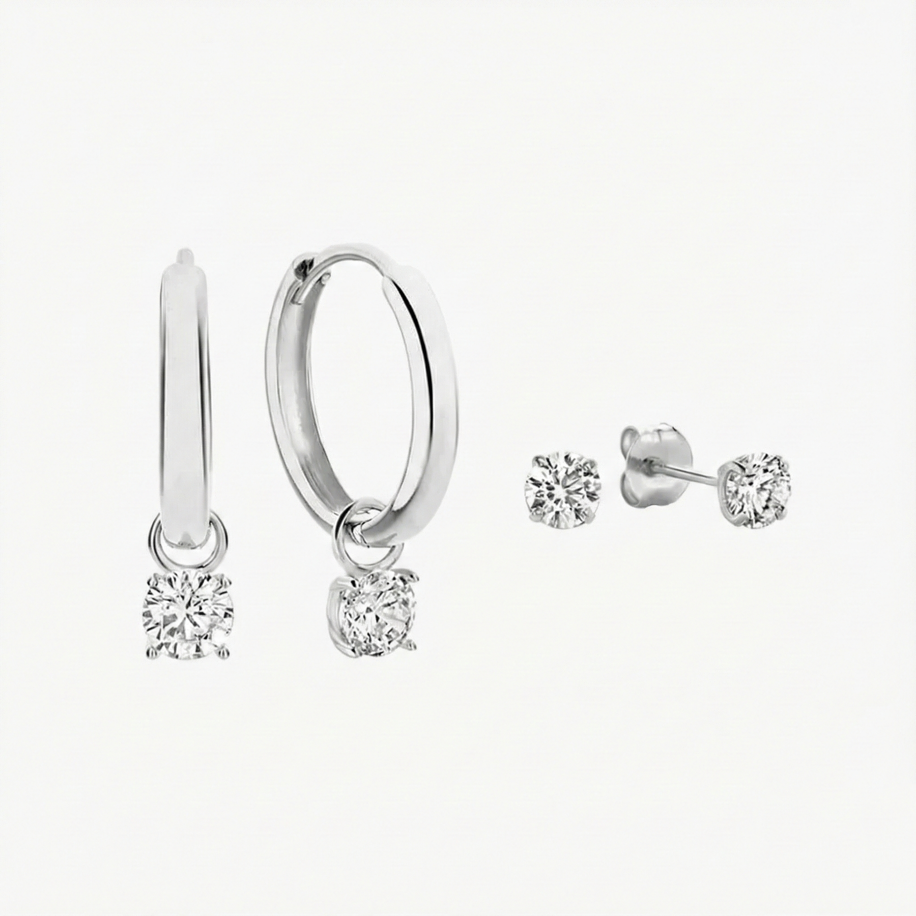 Sada náušníc Larmes de Lune obsahuje zářivé kameny zdobené třpytivými prvky inspirovanými měsícem. S různými designy v jedné sadě nabízí všestrannost pro každodenní eleganci a speciální příležitosti.