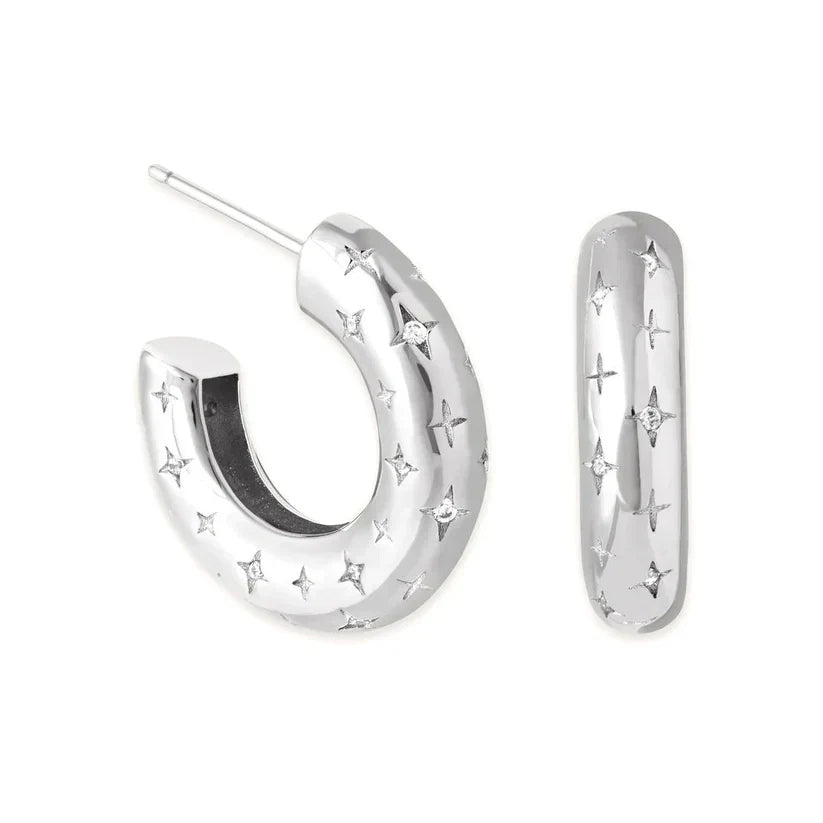 Náušnice Cosmic Hoops sú ozdobené žiarivými kruhmi s jemnými detailmi v tvare hviezdy, ktoré pridávajú nežný nebeský lesk. Moderné, ale nadčasové, prinášajú do tvojho každodenného života dotyk kozmu.